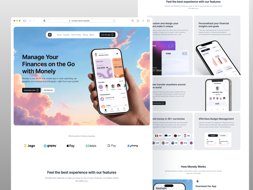 Make a powerful impression with Monely , a modern and sleek Framer template built for financial apps, business startups, fintech platforms, and digital wallet services. With its clean design, intuitive layout, and conversion-focused structure, Monely gives you everything you need to launch a professional and engaging landing page in minutes.